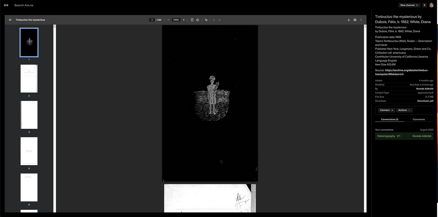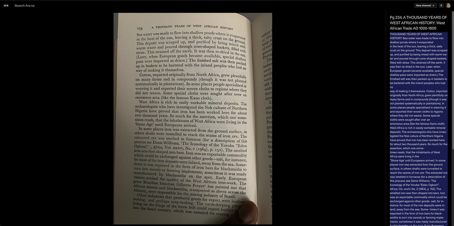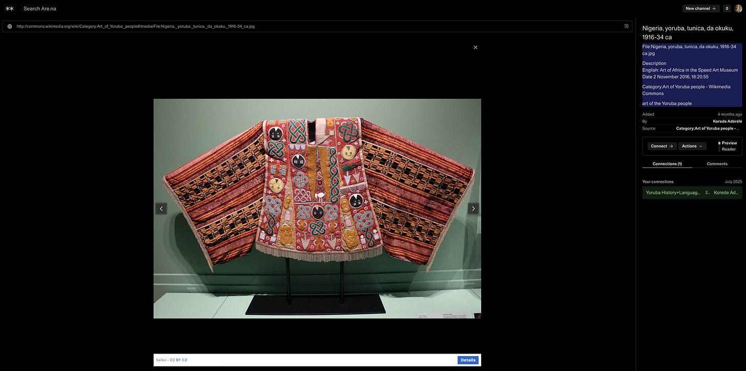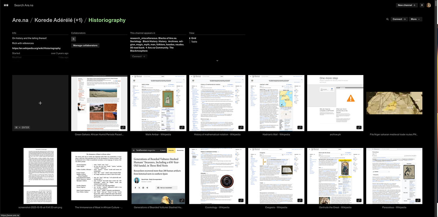 My threads of research in social science and technology are steeped in history and geopolitics as the reference frame. On Are.na, this looks like channels on history and anthropology, with a focus on African states and cultures familiar to me like the Yoruba, channels on permaculture as sustainable ancestral technology, and also channels on topics in psychology, physical science, technology and computing. The contents of these channels are biographies, key events and concepts, articles or papers in various domains. These vary in media type from images, pdfs, web pages, including lots of Wikipedia and YouTube videos, especially for Permaculture content and select documentaries. I strive to ensure the blocks are attributed and include metadata.